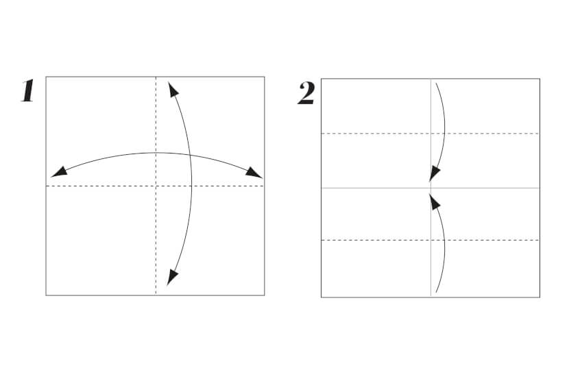 1 Start with a square piece of paper. Fold in half horizontally, crease well, then unfold. Fold in half vertically, crease well, then unfold.