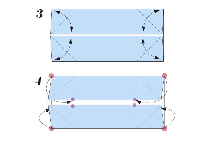 3 Fold all four corners diagonally inwards so the points meet the centre horizontal crease. Crease them well, then unfold.