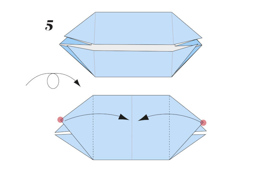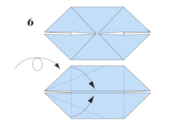 5 Turn the paper over. Fold the top layer’s left and right corners in so they meet at the centre vertical crease.