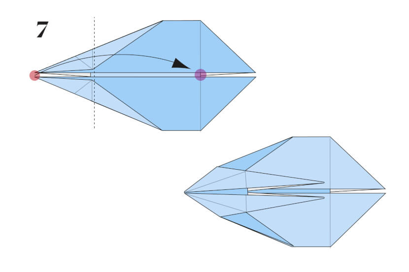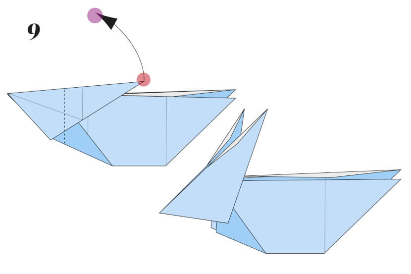 10 Fold both the top and bottom flaps of the right point forward along a diagonal (the dotted) line. Crease well, then unfold.