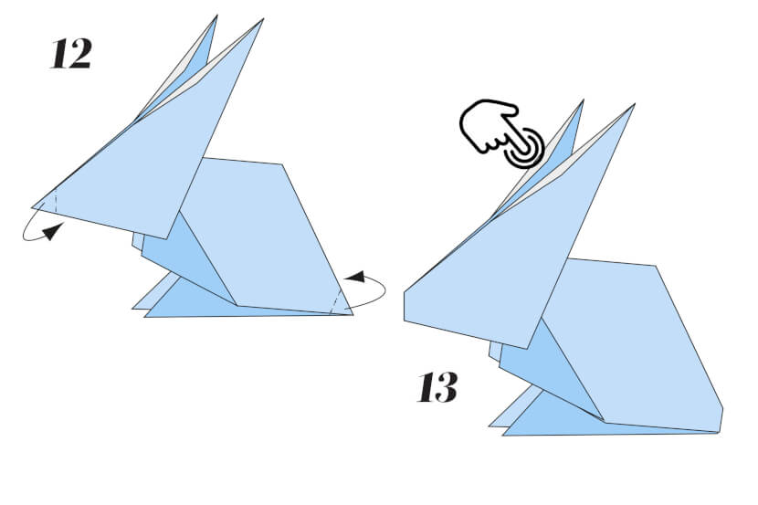 12 Fold the tip of the nose inwards and crease. Then fold both the upper and lower corner flaps inwards to shape the rear of the rabbit. Press firmly.