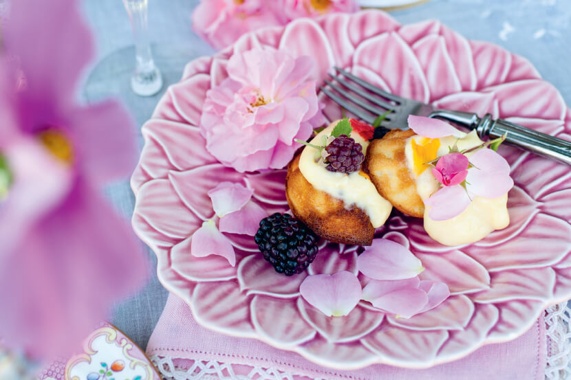 7 Plate the madeleines with a decent dollop of lemon cream and top with fresh berries, such as mulberries, raspberries, strawberries, or blackberries. Garnish with edible petals or flowers.
